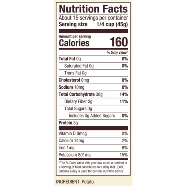 • Ground from whole peeled and dehydrated russet potatoes, our premium quality Potato Flour is perfect for thickening sauces, soups and gravies.