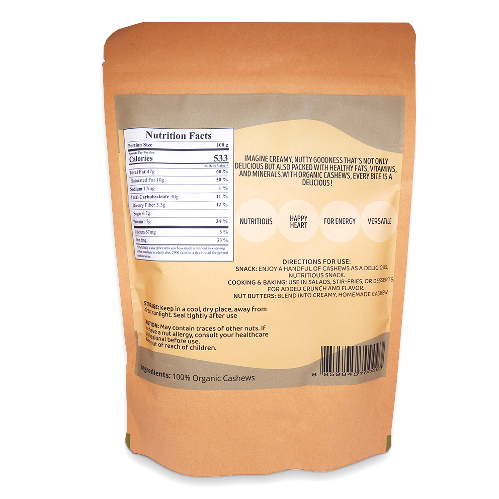 Organic cashews are creamy, nutrient-rich nuts packed with healthy fats, protein, and essential minerals like magnesium, zinc, and iron. They support heart health, boost energy, and promote healthy skin. Cashews can be enjoyed as a snack, blended into dairy-free cashew milk or sauces, added to salads, stir-fries, or desserts, and even used to make creamy vegan cheeses.