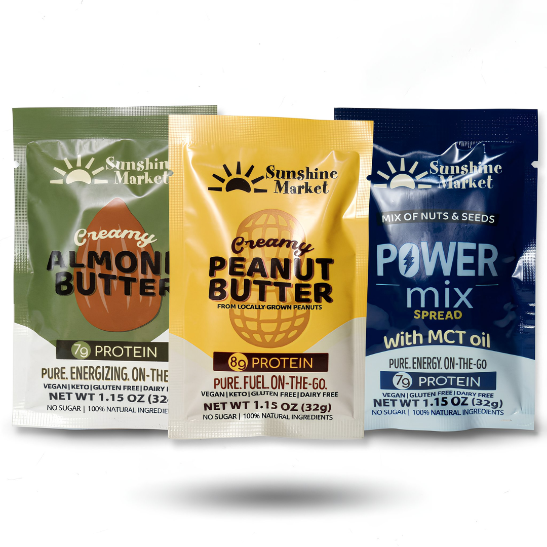 This convenient sachet bundle includes: ✔ Almond Butter ✔ Peanut Butter ✔ Power Mix Spread